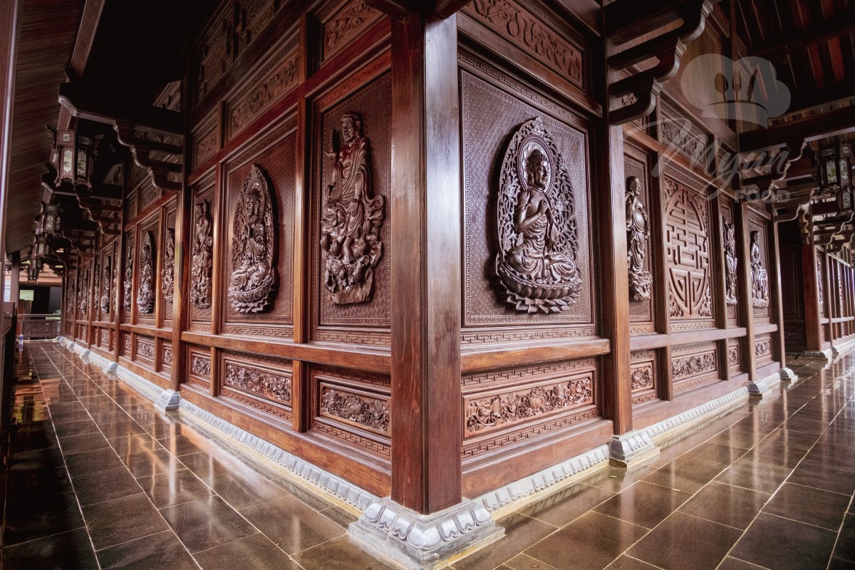 - Tàng kinh các, Tổ đường, tăng xá, nhà Giảng: Liên hoàn nối gót, hành lang lát gạch bát tràng đỏ au, khung cửa gỗ lim 12 cánh, mỗi cánh chạm khắc hoa văn cúc dây – họa tiết truyền thống cung đình.