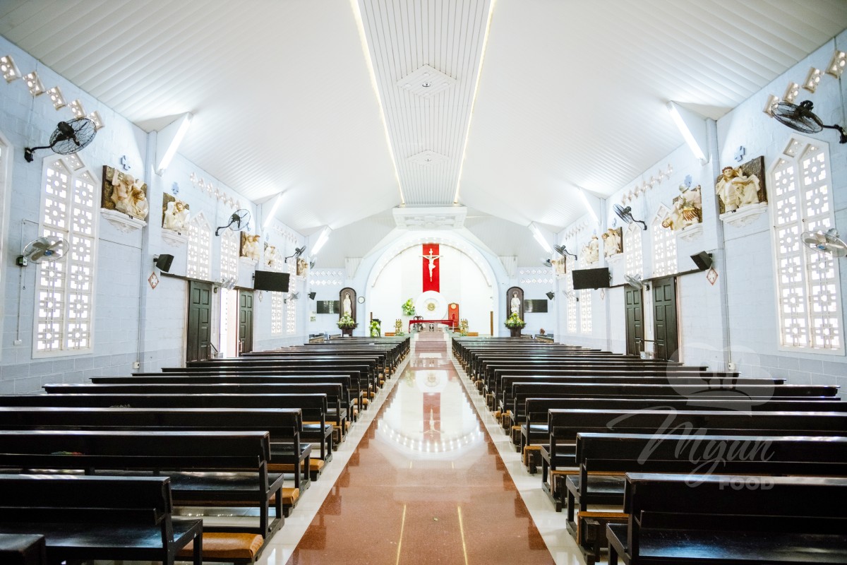 - Khuôn viên nhà thờ rộng rãi, nhiều cây sao, phượng vĩ và sọ khỉ cổ thụ tỏa bóng mát quanh năm. Trên lối gạch dẫn vào chính điện là thảm cỏ xanh, góc nào cũng có thể trở thành phông nền lý tưởng cho những bức ảnh check-in. Du khách ưa khám phá thường chọn buổi sáng sớm hoặc chiều muộn, khi nắng chưa gắt, để dạo bộ, hít hà hương gỗ, hương lá, nhâm nhi ly cà phê rang tay của Myun Food. Với người dân địa phương, sân nhà thờ giống như “khu vườn cộng đồng” – nơi trẻ con nô đùa, người lớn chuyện trò và các cặp đôi chụp ảnh cưới.