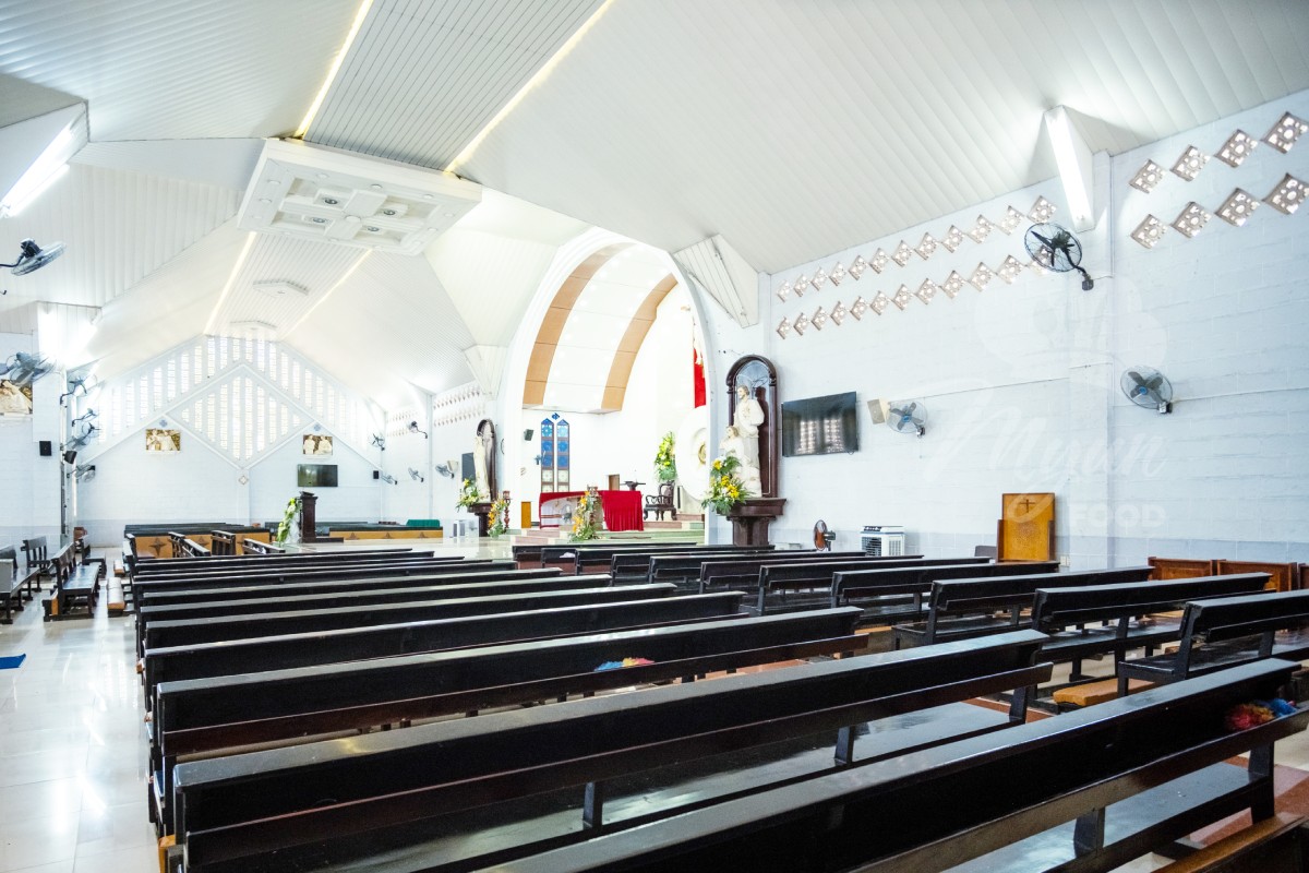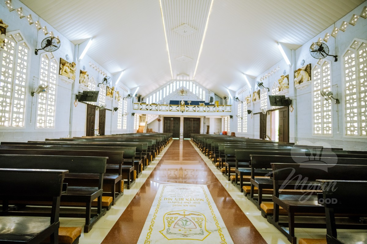 - Nếu chú ý kỹ, bạn sẽ thấy mái nhà thờ có độ dốc lớn, lợp tôn sẫm màu, chia thành nhiều lớp song song giống như từng hàng ván gỗ xếp nối nhau trên mái nhà dài truyền thống. Hệ cột gỗ trần hiện rõ các đường vân, không sơn phủ bóng loáng mà giữ sắc nâu tự nhiên, vừa mộc mạc vừa bền bỉ. Bên trong, lớp trần lợp ván mỏng đan xen, khung dầm chữ A lộ thiên, tạo không gian thoáng đãng và ấm cúng. Sức chứa khoảng 1.200 người nhưng cảm giác “gần gũi” luôn hiện hữu bởi ánh sáng tự nhiên len qua khung cửa kính và mùi nhựa gỗ thoang thoảng trong không khí.