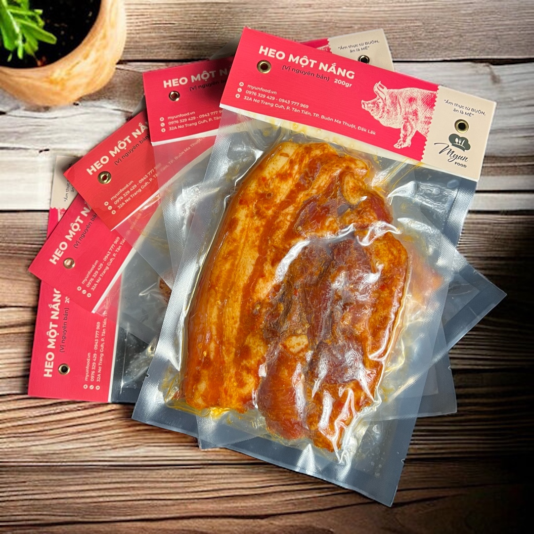 - Thịt ba chỉ heo tươi sau khi sơ chế và xử lý vệ sinh sạch sẻ, được ướp với các gia vị tự nhiên đặc trưng của Tây Nguyên. Sau đó được sấy dưới nhiệt độ 1 ngày nắng cho gia vị thấm đều hòa quyện trong thịt, đóng gói hút chân không ngay sau khi ra lò nên giữ được vị tươi ngon chất lượng của thịt.